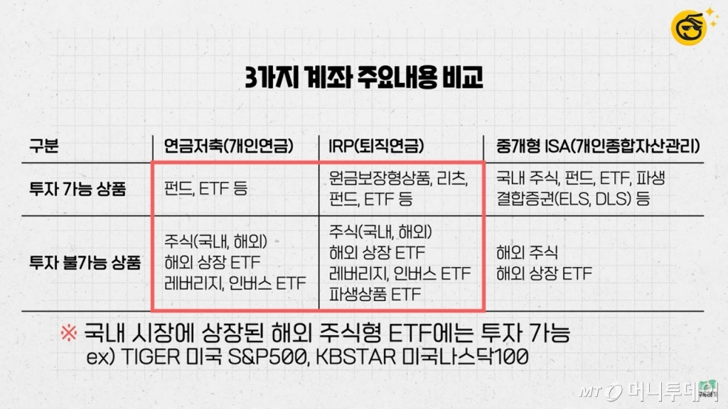 개인연금계좌에 투자할 수 있는 상품을 비교해보면, 연금저축, IRP(개인퇴직연금), 중개형 ISA(개인저축계좌) 등 다양한 옵션이 있습니다. 이들 계좌에서 투자 가능한 상품과 투자 불가능한 상품을 구분하는 것이 중요합니다. 예를 들어, 연금저축 계좌에서는 특정 ETF와 펀드에 투자할 수 있지만, 일부 외국 주식은 투자할 수 없습니다.